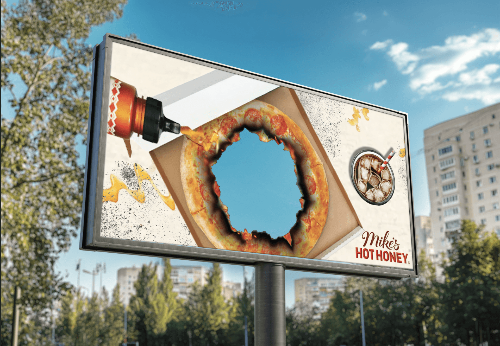 Me and my team decided to run with a billboard showing the melting of the pizza boc and pizza. A visually active billboard that makes it stand out is the clear section of the billboard in the middle.